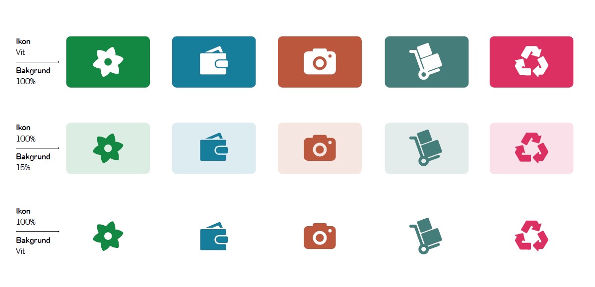 - Färgade ikoner får appliceras i 100 procent på 15 procent bakgrundsfärg. Här blandar vi inte färger utan grön ikon på grön bakgrund osv.