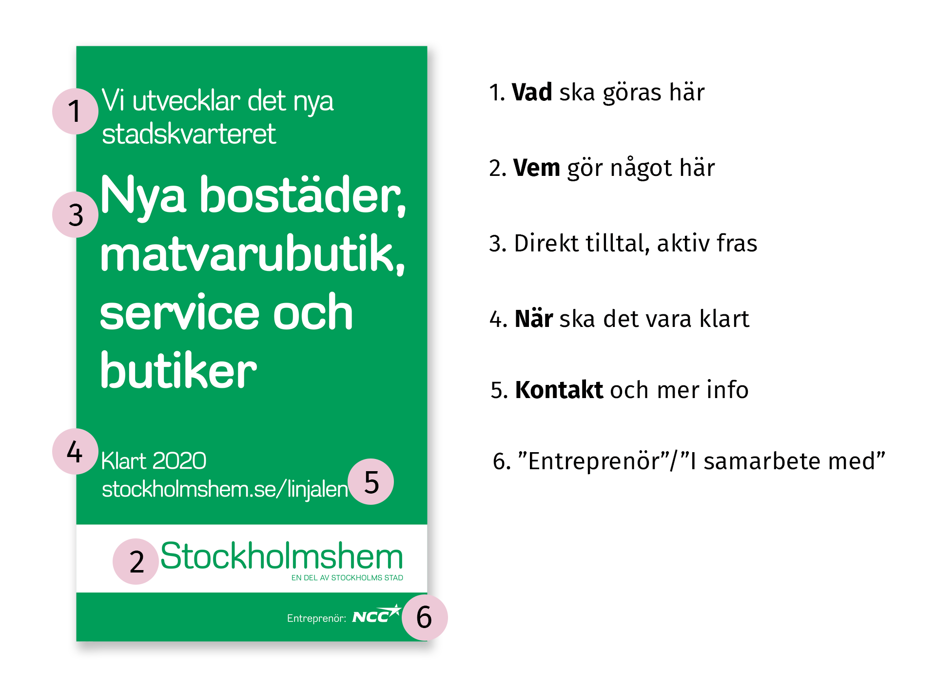 Stockholmshems skyltning följer vår grafiska profil samt stadens varumärkesmanual för byggen och anläggningsarbeten.